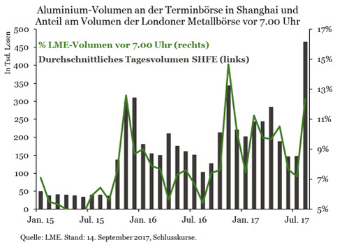 Obwohl der Kupferhandel an der Londoner Metallbörse vor 7.00 Uhr im November 2016 explodierte (ein Hinweis auf Käufe aus Asien), blieben die Volumina aber diesmal stabil. Allerdings nahm das Volumen des LME-Aluminiumhandels vor 7.00 Uhr im August parallel zum Volumen an der Terminbörse in Shanghai zu.