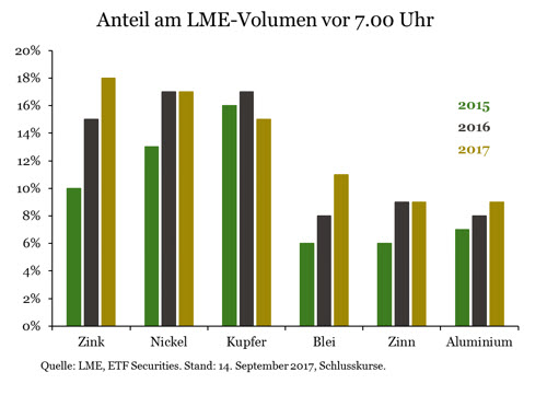 Hier wurden wir vielleicht Zeuge eines allgemeineren Trends, nämlich dass der asiatische Handel die Preise der LME zunehmend stärker beeinflusst. Außer bei Kupfer nimmt der Handel mit den meisten Metallen an der LME zumindest vor 7.00 Uhr seit zwei Jahren zu.
