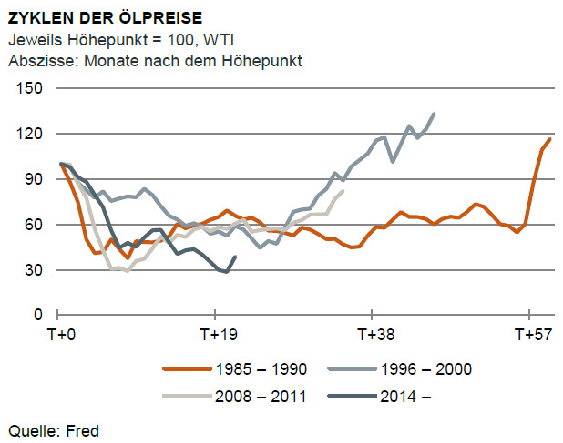 Viertens: Auch hinsichtlich der Länge der Preiszyklen gibt es keine feste Regel. Die bisherigen Zyklen dauerten zwischen drei und fünf Jahren. Der jetzige Zyklus ist noch nicht einmal zwei Jahre alt. Wir müssen uns, gemessen an der Vergangenheit, also noch auf zwei bis drei Jahre mit niedrigen Ölpreisen einstellen.