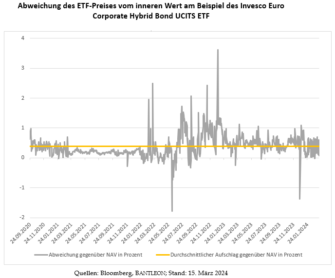 Aktiv gemanagte Investmentfonds kann man nur einmal am Tag zum offiziellen Preis, dem Nettoinventarwert (Net Asset Value = NAV), handeln. ETF hingegen lassen sich in der Regel während der offiziellen Öffnungszeiten an zahlreichen Börsenplätzen handeln. Allerdings ist der Preis, den Anleger dort erhalten beziehungsweise bezahlen, auch nur eine ungefähre Ermittlung des inneren Wertes. Vor allem dann, wenn es sich um ETF aus anderen Zeitzonen oder weniger liquide Anlagen handelt. Je risikoreicher die zugrunde liegenden Anleihen in einem ETF sind, desto wahrscheinlicher ist es, dass der Anleger beim Kauf eine Prämie zahlen muss. In ruhigen Börsenphasen und bei einem sehr liquiden Anleihensegment ist das kein Problem, aber in Stressphasen kann es zu sehr großen Abweichungen zwischen dem gehandelten Preis und dem NAV kommen. Generell kalkulieren ETF-Anbieter einen gewissen Handelsaufschlag ein, den der Kunde zahlt und erweitern in Krisenphasen diese Spanne zwischen An- und Verkaufskosten.