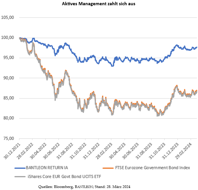 Die Grafik zeigt deutlich den Vorteil von aktivem Management am Beispiel des sicherheitsorientierten EUR-Anleihenfonds Bantleon Return IA: Der Kurseinbruch des »FTSE Eurozone Government Bond Index« und des darauf basierenden iShares Core EUR Govt Bond UCITS ETF war viel stärker. Während Investoren des Anleihenfonds Bantleon Return IA bereits die Verluste fast vollständig aufgeholt haben, ist es für ETF-Anleger noch ein weiter Weg bis in die Gewinnzone.