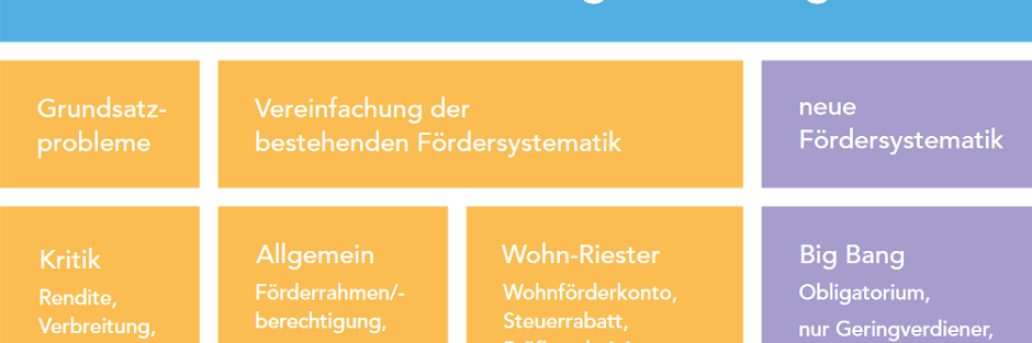 Einen eigenständigen Komplex nehmen in der Studie Vorschläge zur zügigen Vereinfachung von Wohn-Riester ein. So sollten anstatt der Zentralen Zulagenstelle für Altersvermögen die Anbieter die Voraussetzungen prüfen. Die Zulagenstelle müsste dann nur noch stichprobenartig die Prüfberichte kontrollieren. Der Verwaltungsaufwand könnte drastisch reduziert werden, wenn nach der Entnahme für den Bau des Hauses oder den Kauf der Wohnung das Wohnförderkonto ausschließlich von der ZfA geführt würde.
