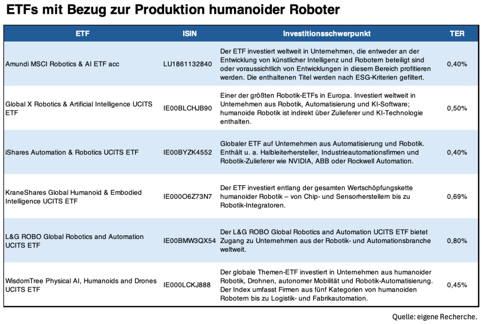 Tatsächlich gibt es bereits einige ETFs, die in Unternehmen entlang der gesamten Robotik-Wertschöpfungskette investieren – also die Herstellung von Sensorik, die industrielle Automatisierung, die Produktion von Halbleitern, Software und KI-Infrastruktur. Viele der Schlüsselunternehmen für humanoide Systeme – etwa NVIDIA oder ABB – finden sich deshalb regelmäßig in den betreffenden Portfolios.