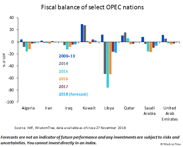 Der Verfall der Ölpreise ab der zweiten Jahreshälfte 2014 schmälerte die Haushaltssalden der OPEC-Mitglieder, deren Regierungen zur Finanzierung stark von den Öleinnahmen abhängig sind. Erst mit der Erholung der Ölpreise im Jahr 2017 konnten wir eine deutliche Verbesserung ihrer Haushaltslage feststellen, trotz der Straffungsmaßnahmen in den Zwischenjahren.