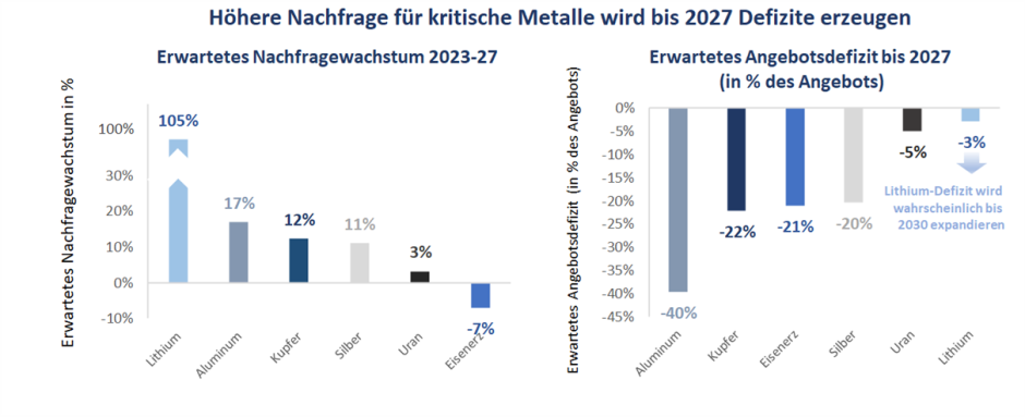 Diese grüne Revolution dürfte mittelfristig die Rohstoffnachfrage, die Preise und das Angebot in die Höhe treiben, wobei bestimmte Teilsektoren überproportional von Anreizen und Regulierungen profitieren werden. So steigt die Nachfrage nach Kupfer und Stahl massiv an, da beide wichtige Bestandteile von Solarmodulen und Windkraftanlagen sind. Die Einführung von Elektrofahrzeugen lässt hingegen den Bedarf nach Batteriemetallen wie Kobalt, Lithium, Mangan und Grafit in die Höhe schnellen. Allein für Lithium hierfür werden laut IEA bis 2030 rund 50 weitere Minen benötigt, was einer Versechsfachung der aktuellen Kapazitäten entspricht. Und der demografische und technologische Wandel weltweit benötigt ebenfalls große Mengen an Industriemetallen sowie Seltene Erden, was zu einem Angebotsdefizit führen wird.