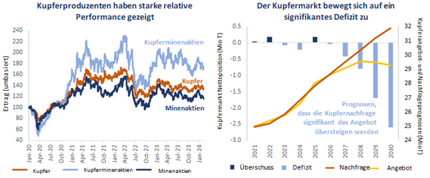 Es ist bisher ein gutes Jahr für alle, die an Kupfer geglaubt haben. Denn das Industriemetall, das unter anderem in Kabeln, Rohren, Drähten und Schienen zum Einsatz kommt, performt 2024 überraschend stark. Seit Januar ist die Notierung um zwischenzeitlich knapp zehn Prozent auf über 9000 US-Dollar die Tonne geklettert und liegt heute bei rund 8800 US-Dollar die Tonne. Dieser Sprung bescherte auch vielen Aktien von Kupferproduzenten deutliche Kursgewinne. So kletterten die Papiere von Bergbaukonzern Freeport-McMoRan um sieben Prozent, Southern Copper um 22 Prozent und Teck Resources um 7,5 Prozent seit Jahresbeginn nach oben. Es sind neben den leicht verbesserten globalen Konjunkturaussichten vor allem wachsende Angebotsprobleme weltweit, die den Preis des Industriemetalls treiben. Bis vor kurzem deuteten die Prognosen auf einen Überschuss auf dem Kupfermarkt im Jahr 2024 hin, während Versorgungsengpässe erst gegen Ende des Jahrzehnts erwartet wurden. Doch Produktionsunterbrechungen, Herabstufungen der Prognosen, wachsende Genehmigungsprobleme und sinkende Gehalte (Grades) haben zu einem Angebotsdefizit geführt. Zuletzt drosselten etwa wichtige chinesische Kupferhütten ihre Produktion in einigen verlustbringenden Anlagen und verschoben die Inbetriebnahme neuer Produktionsstätten. Auch die Forderung Panamas, dass First Quantum Minerals die Produktion in seiner Mine Cobre Panama aussetzen muss, sorgte am Markt für neue Sorgen. Sollte die Cobre Panama-Mine doch in diesem Jahr 385.000 Tonnen Kupfer produzieren, was 1,75 Prozent des weltweiten Kupferangebots entspricht. Ein weiterer Dämpfer war, dass der Bergbaukonzern Anglo American seine Produktionsprognose für 2024 aufgrund geotechnischer Probleme um 195 000 Tonnen senken musste, was allein fast einem Prozent des weltweiten Angebots entspricht. Ein weiteres Beispiel für die Herausforderungen des Kupfermarktes ist auch das verzögerte Produktionswachstum in der Escondida-Kupfermine von BHP aufgrund von Genehmigungen und Studien.