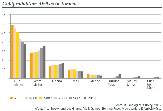 Mit einer Jahresproduktion von rund 450 Tonnen im Jahr 2010 stelle Afrika eine der weltweit wichtigsten Regionen für die Goldproduktion dar. Schürfte Südafrika im Jahr 1970 noch rund 1.000 Tonnen Gold, nehme die Produktion dort immer mehr ab. Dagegen wachse die Förderung in Westafrika, insbesondere in den großen Produzentenländern Ghana und Burkina Faso. Aber auch Guinea, Mali, Mauretanien und die Elfenbeinküste stünden vor einer kräftigen Steigerung ihrer Förderung. Südafrika sei jedoch noch immer wichtigster Produzent für Platin. Produzierte das Land im Jahr 2000 rund 3,8 Millionen Unzen des Edelmetalls, waren es 2011 schon rund 4,9 Millionen. Simbabwe entwickle sich der Studie zufolge zu einem zweiten bedeutenden Platinproduzenten. Die ersten Produktionsdaten habe es zwar erst im Jahr 2002 gegeben. Doch sei die Produktion von damals rund 60.000 Unzen auf 340.000 Unzen im Jahr 2011 gestiegen. Voraussetzung für einen weiteren Anstieg der Produktionen stellten vor allem ausländische Investitionen in die Bergbauindustrie dar.