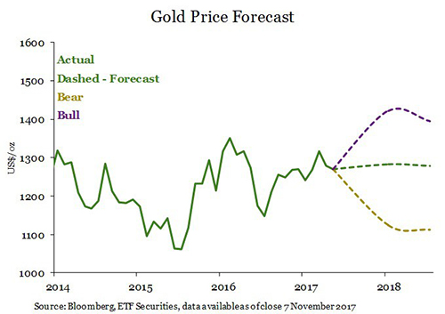In our bear case, we assume the Fed delivers four rates hikes in 2018 as it tries to anchor inflation expectations. 10-year nominal Treasury yields rise to 3.3% by the end of the year, while the US dollar appreciates. By year-end inflation falls back to 1.6%. In this scenario we assume that the absence of any geopolitical risk or adverse financial market shock. In this scenario gold could fall to US$1110/oz by end of 2018.
