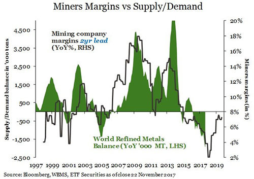 Historically we have found that metal markets begin to move towards a balance two years after miner profit margins hit rock-bottom. Miner margins fell to a low of 2% at the beginning of 2016 and since have recovered to just over 7%. So if we see a repeat of historical patterns, we should see supply begin to improve in late 2018, but it could take years to move back into balance.