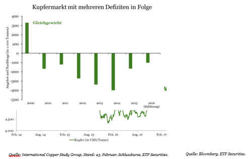Auch wenn sich der Markt auf den Erfolg oder Misserfolg der Infrastrukturpläne in den USA konzentriert, entwickelt sich die Nachfrage des weltgrößten Kupferverbrauchers China, die über 50 Prozent der Nachfrage nach dem Fertigmetall ausmacht, weiterhin robust. Da die chinesischen Behörden ihre entgegenkommende Geldpolitik vor dem 19. Parteitag der Kommunistischen Partei im Herbst beibehalten werden, wird sich daran wohl nichts ändern. Aus einer eher strukturellen Sicht dürfte aufgrund der Zunahme umweltfreundlicherer, aber kupferintensiver Elektrofahrzeuge die Nachfrage nach Kupfer hoch bleiben.