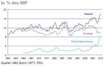 Der Rückgang der Rohstoffpreise könnte jedoch auch die Folge eines deutlich gestiegenen Angebots sein – und wäre dann kein Indikator für die Nachfrageentwicklung. So prognostiziert beispielsweise der Internationale Währungsfonds (IWF) in seinem „Global Outlook“ für dieses Jahr einen Anstieg der Rohstoffproduktion und Preisrückgänge bei vielen Rohstoffen. Beispielsweise haben sich in Australien die Investitionen in die Rohstoffgewinnung erhöht, von etwa 1 % des BIP im Jahr 2000 auf über 8 %.