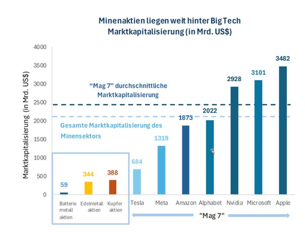 Nichts geht mehr in Zukunft ohne die Unternehmen, die die Bodenschätze suchen, heben und veredeln. Doch angesichts der goldenen Aussichten und ihrer Bedeutung spielen BHP, Rio Tinto und Co an den Börsen eine zu geringe Rolle. So liegt die Marktkapitalisierung der gesamten Kupferbergbauindustrie bei etwa 388 Milliarden US-Dollar. Das ist in etwa nur ein Viertel des Werts vom Google-Mutterkonzern Meta (Siehe Grafik).