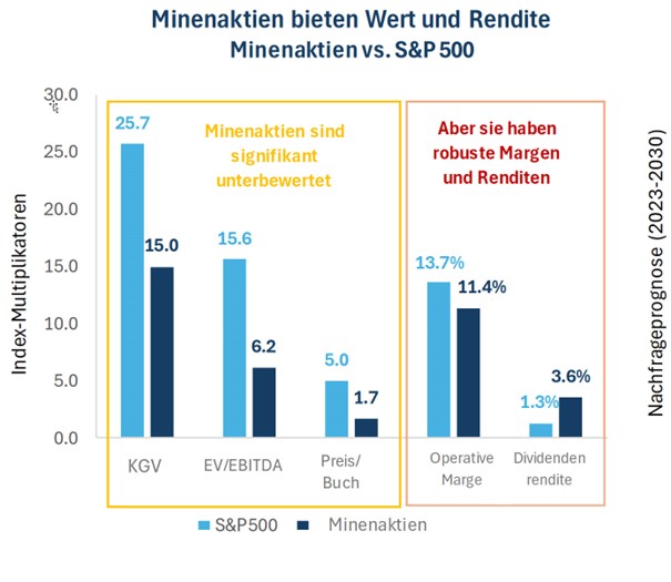 Aber Minenaktien werden die Aufmerksamkeit von Investoren wieder auf sich ziehen, da sie gleich mehrere Vorteile bieten. Aus der Perspektive des Portfoliomanagements haben Aktien von Bergbauunternehmen eine geringe Korrelation zu US-Aktienmärkten, wobei Edelmetalle die geringste Korrelation aufweisen und somit eine wertvolle Diversifizierung bieten. Bergbauaktien bieten zudem als thematisches Investment die Gelegenheit, sich sehr direkt am Wachstum der grünen Technologie und dem Übergang zu sauberer Energie zu beteiligen. Und fundamental betrachtet ist der Minensektor eine Assetklasse, die Wert, Rendite und Wachstum bietet. Der Sektor erscheint relativ und historisch unterbewertet, während die Margen weitgehend robust und die Dividendenrenditen im Vergleich zu den breiteren Aktienmärkten stark sind (siehe Grafik 3).