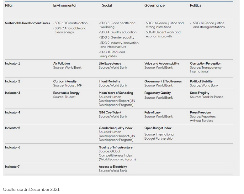 Die folgende Tabelle zeigt die Indikatoren, die wir verfolgen, und die Datenquellen. Die ESGP-Gesamtbewertung entspricht dem gleichgewichteten Durchschnitt der Einzelbewertungen (für E, S, G und P).