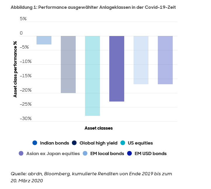 Ein weiterer Faktor ist die relativ bessere Performance indischer Anleihen in schwierigeren Marktumfeldern. So verlor der inländische Anleihenmarkt Indiens vom Jahresende 2019 bis zum Höhepunkt des Marktabverkaufs während der Covid-19-Krise am 20. März 2020 nur 3 % (einschließlich der Auswirkungen von Wechselkursen). Wie unten dargestellt, übertraf diese Performance viele andere Anlageklassen deutlich.