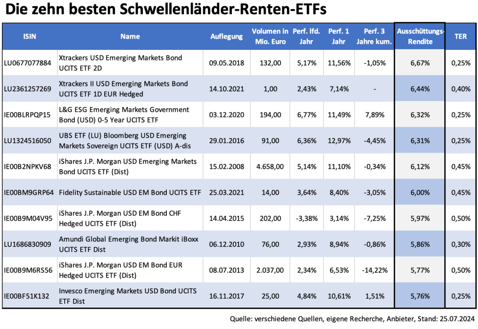 Der Schwellenländer-Renten-ETF mit der höchsten Ausschüttungsrendite zum Beispiel, der Xtrackers USD Emerging Markets Bond UCITS ETF 2D, weist eine TER von nur 0,25 Prozent per annum aus. Auch der L&G ESG Emerging Markets Government Bond (USD) 0-5 Year UCITS ETF bescheidet sich mit einem Viertelprozent pro Jahr. Der ETF punktet nicht nur mit einer hohen Ausschüttungsrendite, sondern lässt im laufenden Jahr und im Dreijahresranking die Konkurrenz hinter sich. Der mit rund 4,7 Milliarden Euro Anlagevolumen größte unter den zehn besten Emerging Markets-ETFs, der iShares J.P. Morgan USD Emerging Markets Bond UCITS ETF (Dist), ist mit einer TER von 0,45 Prozent per annum zwar kein Schnäppchen, überzeugt aber ebenfalls mit einer guten Performance und einer hohen Ausschüttungsrendite.