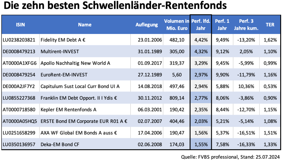 An erster Stelle unter den Top-Performern im Bereich der Schwellenländer-Rentenfonds steht aktuell der Fidelity Funds - Emerging Market Debt Fund A (EUR). DIe Fondsmanager Paul Greer, Eric Wong und Marton Huebler investieren ohne Kompromisse ausschließlich in Anleihen aus Schwellenländern. Die größten Positionen des Artikel-8-Fonds sind Papiere aus Saudi-Arabien, Panama, Ägypten, der Türkei und der Dominikanischen Republik. Sowohl im laufenden Jahr als auch über die vergangenen zwölf Monate hinweg hat der Fidelity-Fonds die Konkurrenten aus seiner Peergroup hinter sich gelassen. Im 3-Jahresvergleich schneidet der Fonds jedoch nicht ganz so glänzend ab.