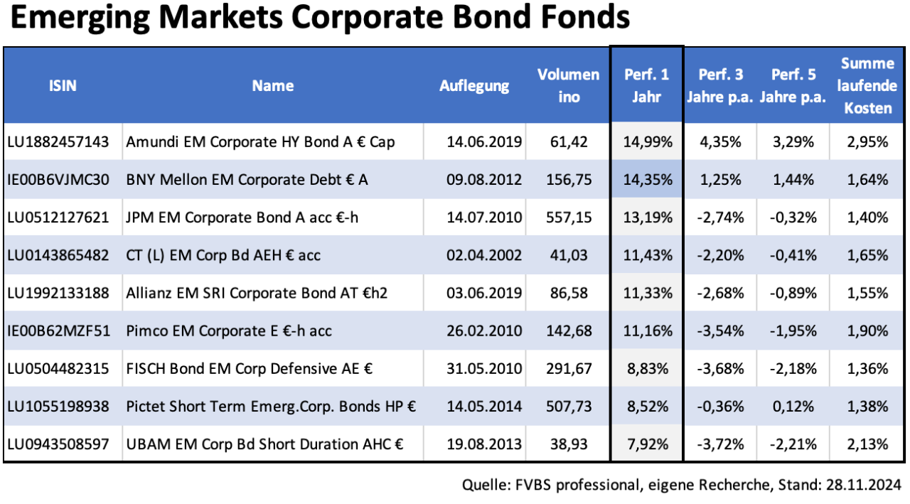 Bei Unternehmensanleihen aus Schwellenländern sieht die Lage deutlich positiver aus. Diese Anleihen haben sich in der Vergangenheit als stabil erwiesen, selbst in schwierigen Zeiten. Auch jetzt bleiben sie eine attraktive Möglichkeit für Anleger, vor allem wegen der relativ hohen Renditen. Allerdings gibt es auch hier regionale Unterschiede. In Ländern wie Mexiko oder in einigen asiatischen Schwellenländern könnten höhere US-Zölle und steigende Finanzierungskosten Unternehmen stärker belasten, weshalb eine genaue Auswahl hier besonders wichtig ist. So lohnt etwa ein Blick in das Fondsportfolio des Performance-Spitzenreiters in diesem Segment. Der Amundi Emerging Markets Corporate High Yield Bond A versammelt unter seinem Dach eine bunte Mischung von Unternehmensanleihen aus aller Herren Länder, darunter Bonds aus Kolumbien, Mauritius oder Papua-Neuguinea, aber auch japanische oder kanadische Corporate Bonds. Argentinische Anleihen machen mehr als fünf Prozent des Portfolios aus. Mexiko ist mit etwas mehr als vier Prozent vertreten. Die Inkaufnahme der Risiken hat sich für Anleger, die den Fonds im Depot haben, in den zurückliegenden zwölf Monaten mit einer Rendite von fast 15 Prozent ausgezahlt. Risikoärmer ist der UBAM EM Corporate Bonds Short Duration AHC unterwegs. Der Rentenfonds setzt explizit auf Kurzläufer und steuert so das Risiko der Folgen von Zins- und Währungsschwankungen herunter. Dies und die recht hohen laufenden Kosten des Fonds schmälern im die Rendite.