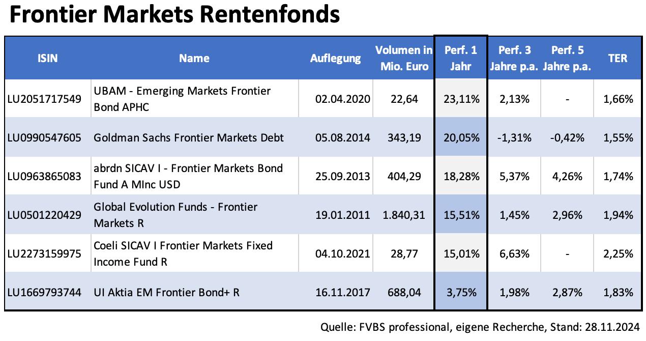 Mit anderen Worten: Die Kurse bereits emittierter Anleihen könnten sinken – und damit auch die Preise für die Frontier Markets Fonds. Davon gibt es aktuell sechs Stück, siehe Tabelle. Bis auf den abdrn SICAV I – Frontier Markets Bond Fund sind alle hier aufgeführten Fonds thesaurierende Hauptanteilsklassen. Dass die Frontier Markets kein einfaches Pflaster sind, zeigt die unterschiedliche Performance der Rentenfonds. Den UBAM - Emerging Markets Frontier Bond APHC und dem UI Aktia EM Frontier Bond+ R trennen bemerkenswerte 20 Prozentpunkte an Wertentwicklung – wohlgemerkt für einen Zeitraum von zwölf Monaten.
