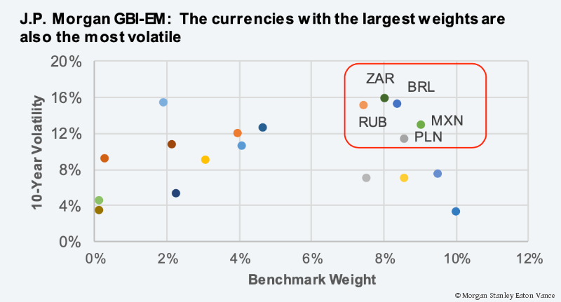 Dabei liege die Lösung des Problems auf der Hand, erklärt Matt Murphy, Institutional Portfolio Manager im Eaton Vance EMD Team, auf der FondsConsult Investment-Konferenz am Tegernsee. „Es gibt zwar zahlreiche Anleihemärkte in den Schwellenländern. Doch die Benchmarks, an denen sich die meisten Investoren orientieren, konzentrieren sich nur auf wenige Märkte. Und das sind ausgerechnet Märkte mit hoch volatilen Währungen. Für die meisten Investoren ist das ein Problem. Für uns ist diese Erkenntnis jedoch der Schlüssel zur Auflösung des Rendite-Risiko-Dilemmas in diesem Marktsegment“, erklärt Murphy.