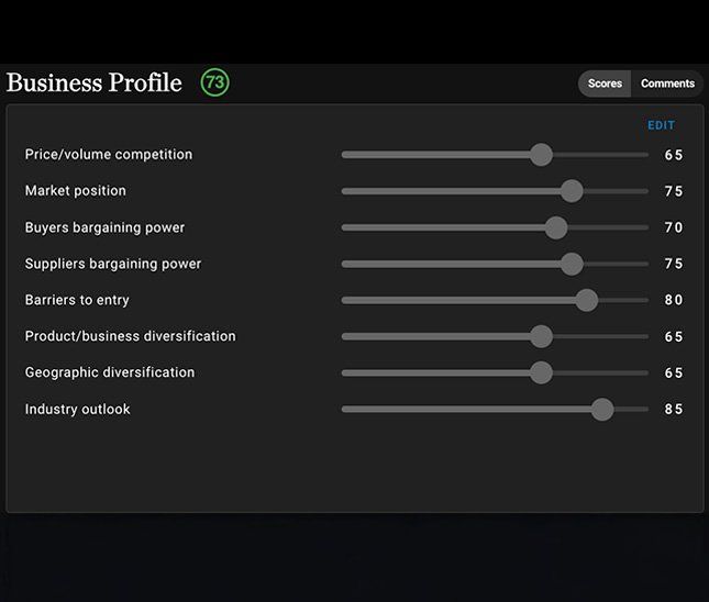 Im Abschnitt „Geschäftsprofil“ betrachten wir beispielsweise Faktoren wie Wettbewerbsposition, Verhandlungsmacht, Diversifizierung und Branchenaussichten.