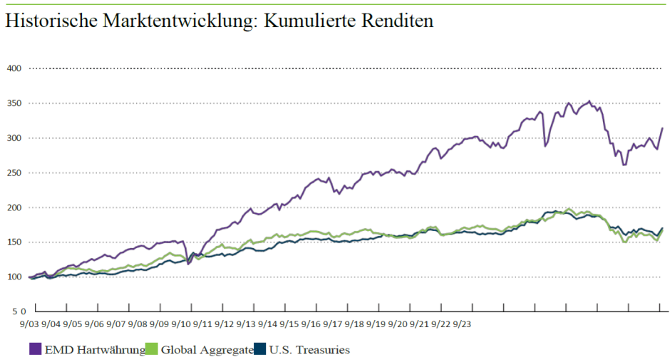 Quellen: Bloomberg und J.P. Morgan, Stand: 31. Dezember 2023. Die Wertentwicklung in der Vergangenheit ist kein Indikator für die künftige Rendite. Eine Direktanlage in einen nicht verwalteten Index ist nicht möglich. Siehe nächste Seite für die Indexdarstellung.