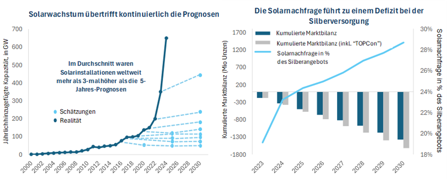 Der Silbermarkt produziert jährlich aktuell etwas über eine Milliarde Unzen. Angesichts des schnellen Ausbaus der Solarenergie könnte das kumulative Defizit bis 2030 zwischen 1,4 und 1,6 Milliarden Unzen betragen. Neben dem Anstieg der Solarnachfrage wird auch eine Zunahme der Verwendung von Silber in anderen Industriebranchen erwartet, was positive Aussichten für den Silberpreis und die Minenbetreiber bietet.