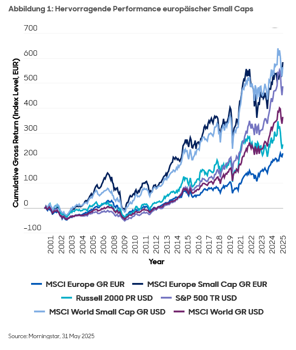 Als langfristige Anlage sind Small Caps kaum zu übertreffen. Seit Beginn der Erfassung zuverlässiger Daten im Januar 2001 haben sie in allen wichtigen Regionen fast durchweg eine Outperformance gegenüber Large Caps erzielt. Europa sticht dabei besonders hervor: Im Laufe dieses Jahrhunderts waren europäische Small Caps – mit Ausnahme des Jahres 2002 und einer kurzen Phase zwischen Ende 2024 und Anfang 2025 – die Anlageklasse mit der besten Performance in den Industrieländern und übertrafen sowohl den S&P 500 als auch globale Aktien [1].