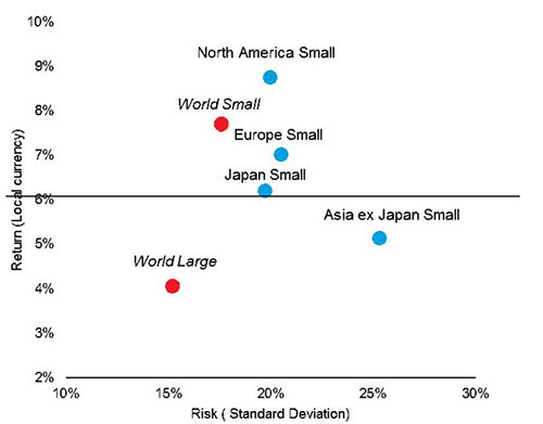 Abb. 2: Risiko-Ertrags-Profil Small-Cap-Index vs. globale Large-Caps