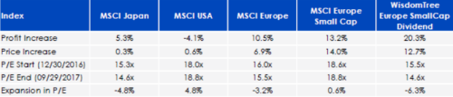 (Quellen: WisdomTree, FactSet, Bloomberg, 29.09.2017. Berechnung von Gewinn- und Kursanstieg in Euro. KGV gemessen als Forward-KGV. Wertsteigerungen in der Vergangenheit lassen keinen Schluss auf zukünftige Ergebnisse zu. Direktinvestitionen in den Index sind nicht möglich. Die Indexperformance stellt nicht die tatsächliche Wertentwicklung des Fonds oder Portfolios dar. Ein Fonds oder Portfolio kann sich deutlich von den im Index enthaltenden Wertpapieren unterscheiden. Die Indexperformance basiert auf der Wiederanlage von Dividenden, berücksichtigt aber weder Managementgebühren, Transaktionskosten oder anderweitige Auslagen, die in Zusammenhang mit einem Portfolio oder Fonds anfallen, noch Vermittlungsprovisionen für Wertpapiergeschäfte. Derartige Gebühren, Ausgaben und Provisionen können den Ertrag mindern.)