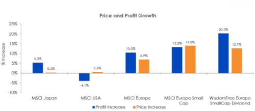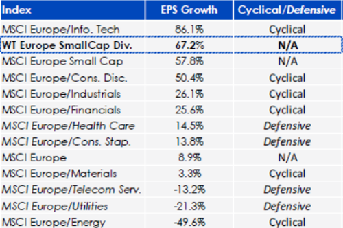 Wenn Sie an die Value-Prämie bei Small-Caps und die europäische Wachstumsstory im Allgemeinen glauben, dann ist jetzt möglicherweise der Zeitpunkt, das Augenmerk auf die verhältnismäßig günstigen Kennzahlen des WisdomTree Europe SmallCap Dividend Index und das zugrundeliegende Gewinnwachstum zu werfen. Der WisdomTree Europe SmallCap Dividend Fund (DFE) wurde im Juni 2006 lanciert, um diesen Index nachzubilden. Die Wachstumsbelebung im laufenden Jahr zusammen mit der Outperformance von Small-Caps sind lediglich das jüngste Beispiel dafür, wie diese Strategie als Instrument für den Zugang zu zyklischem Wachstum eingesetzt werden kann.