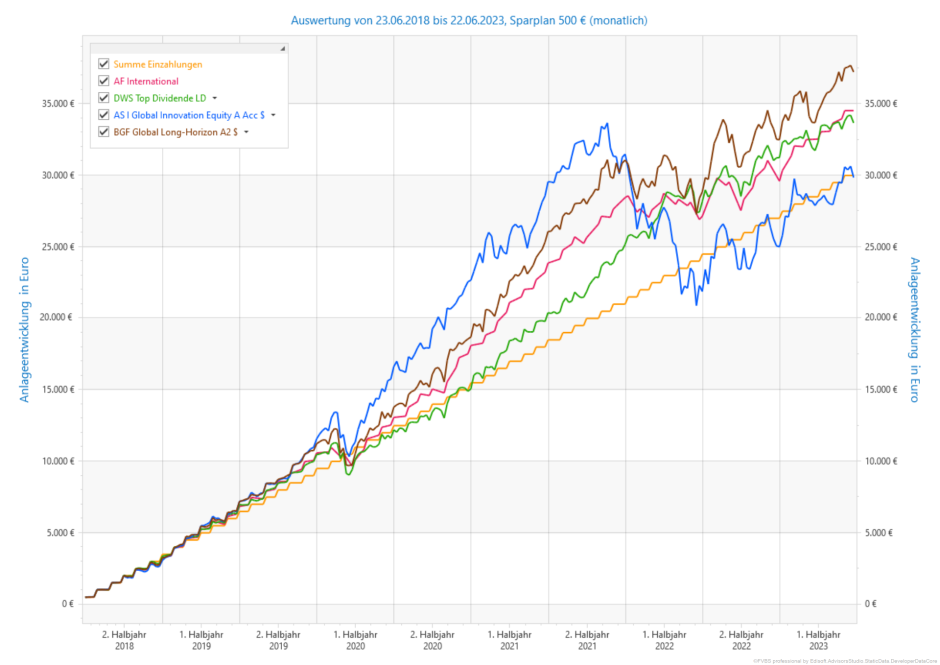 | Auswertung von 21.06.2018 bis 21.06.2023, Sparplan 500 € (monatlich) | ||||