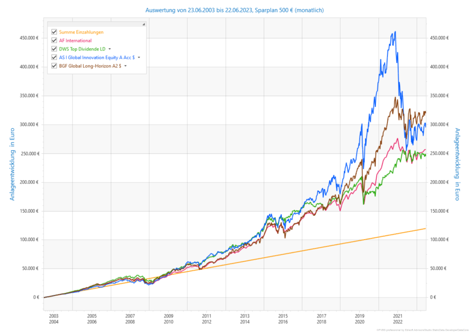 | Auswertung von 23.06.2003 bis 22.06.2023, Sparplan 500 € (monatlich) | |||||