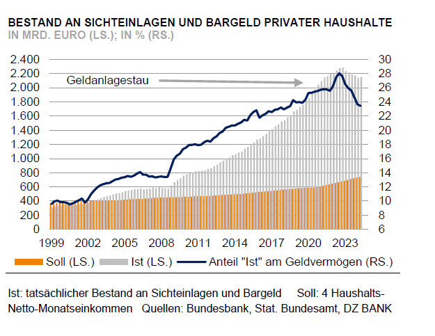 Mit dem DAX auf einem Rekordhoch und einer soliden Jahresperformance von über 17 Prozent seit Januar scheint das Potenzial des Aktienmarkts greifbarer als je zuvor. Dennoch „parken“ laut der DZ Bank Haushalte weiterhin rund 2,2 Billionen Euro in niedrig verzinsten oder unverzinsten Sichteinlagen oder Bargeld, was etwa einem Viertel des gesamten Geldvermögens der Deutschen entspricht. Der Wert zeigt, wie vorsichtig viele Deutsche in ihren Anlageentscheidungen sind, doch gleichzeitig auch, wie groß das ungenutzte Potential ist.