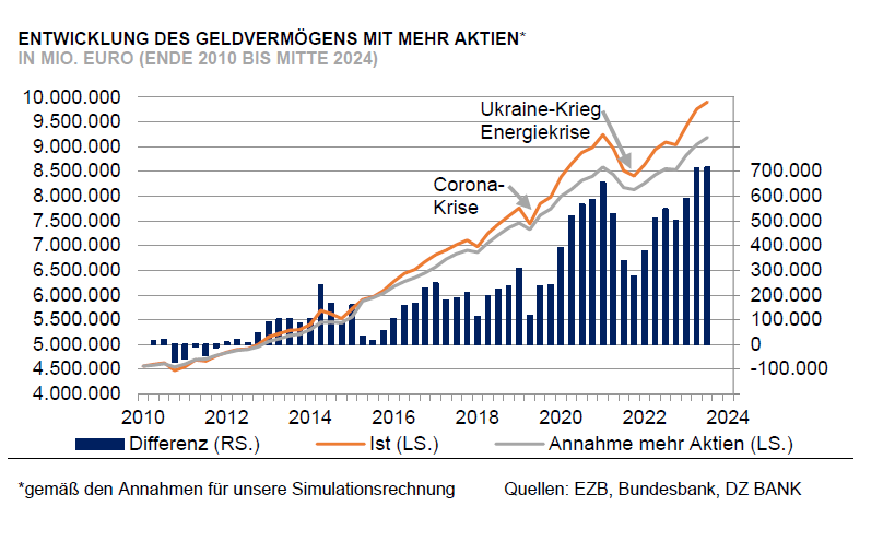 Eine kürzlich durchgeführte Simulationsrechnung der DZ Bank illustriert, wie sich das Geldvermögen bei einer stärkeren Aktiengewichtung hätte entwickeln können. Mit einer hypothetischen Umschichtung von 355 Milliarden Euro aus Sichteinlagen in Aktien im Jahr 2011 und einer verringerten Anlage in Sichteinlagen von 30,6 Milliarden auf nur noch 4,4 Milliarden Euro pro Quartal zeigt die Simulation einen deutlichen Vermögenszuwachs. Das Modell ergibt, dass das Geldvermögen durch die fiktiven Aktienanlagen bis Mitte 2024 um 5,3 Billionen Euro auf insgesamt 9,9 Billionen Euro angewachsen wäre – 715 Milliarden Euro mehr als die reale Vermögensentwicklung.