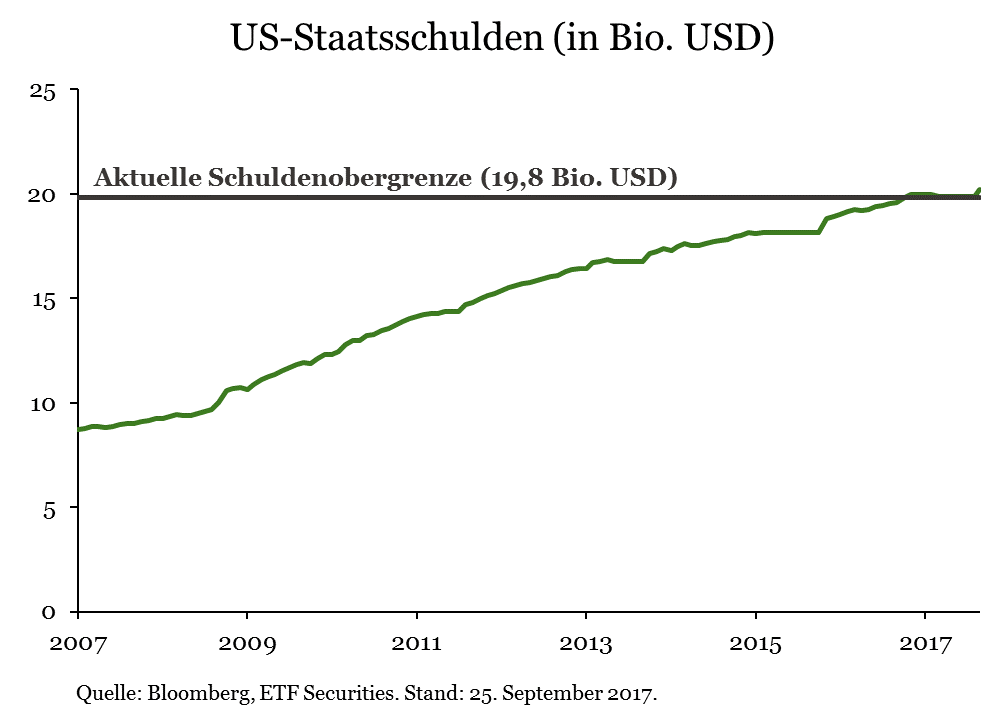 Bereits Anfang September einigten sich Präsident Trump und die Demokraten unerwartet in der Frage der Anhebung der Schuldenobergrenze, was auch eine Katastrophenhilfe in Höhe 15 Mrd. USD einschloss, die Texas nach Hurrikan Harvey Ende August zukommt. Mit dieser Maßnahme erhält der öffentliche Dienst bis Anfang Dezember vorübergehend die nötigen Finanzmittel (continuing resolution). Um aber eine Stilllegung der Verwaltung oder einen möglichen Zahlungsverzug zu vermeiden, muss das Gesetz zur Bewilligung von Haushaltsmitteln 2018 vom Kongress am 8. Dezember verabschiedet werden. So könnte die Debatte über die Schuldenobergrenze zwar über die Zwischenwahlen des nächsten Jahrs hinaus anhalten, doch ist die Abstimmung im Dezember für die Anleger von hoher Bedeutung.