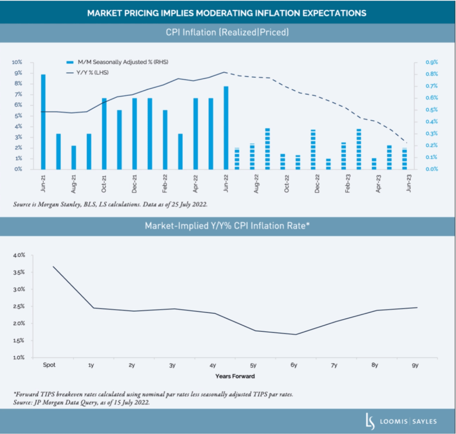 "Überraschenderweise zeigen die Daten vom Markt für inflationsgeschützte US-Staatsanleihen (Treasury Inflation-Protected Securities, TIPS) und Anleihederivate aus dem 1. Halbjahr, dass Anleger mit einer raschen Abschwächung des Preisdrucks von derzeit über 9% auf etwa 2% innerhalb von 12 Monaten rechnen“, schreibt Michael Gladchun, Senior-Anleihestratege beim US-amerikanischen Asset Manager Loomis Sayles, in seiner aktuellen Analyse. Diese Einschätzung der Marktteilnehmer sei angesichts einer anhaltend hohen Inflation und restriktiver Maßnahmen der Zentralbanken eher zu optimistisch. Sie führe aber auch dazu, dass TIPS jetzt für Anleger günstig zu haben sein scheinen.