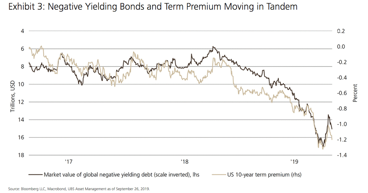 As global financial markets are integrated, investors facing negative yields are incentivized to look for positive yielding alternatives. There is a scarcity of positive yielding defensive assets in the world, so global capital piles into what’s remaining. Exhibit 3 shows how the term premium on US Treasuries has tracked the sharp rise in negative yielding debt globally.