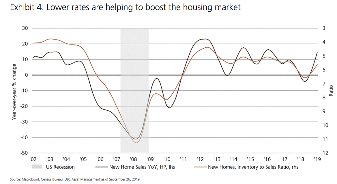 The good news for now is that, at least in the US, the low bond yields we’ve discussed look enough to cushion the economy from a major downturn, in our view. Amid much lower mortgage rates, the US housing market is staging a healthy rebound. It is not easy for the household-driven US economy to fall into recession with the housing market itself in an upcycle.