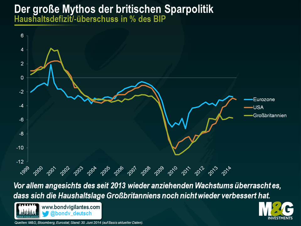 In der nachfolgenden Grafik wird der Saldo des britischen Staatshaushaushalts im internationalen Vergleich betrachtet. In den USA kam es zuletzt zu einer sehr umfassenden Haushaltskonsolidierung, die das Wirtschaftswachstum in den Jahren 2011 bis 2013 stark belastet hat. Dieser Effekt sollte zukünftig aber deutlich nachlassen. Auch aus diesem Grund sind wir für die US-Wirtschaft zuversichtlich. In der Eurozone wiederum wurde eine solche Haushaltskonsolidierung von den Märkten gewissermaßen erzwungen, obwohl der Euroraum insgesamt (ebenso wie die USA) momentan ein Haushaltsdefizit aufweist, das dem der Jahre 2004 und 2005 entspricht. Derweil wird Deutschland – ein Land, das von den Märkten bisher überhaupt nicht unter Druck gesetzt worden ist – in diesem Jahr wohl einen ausgeglichen Haushalt vorlegen können. In Großbritannien war das Wirtschaftswachstum auf Jahresbasis gerechnet bis zum II. Quartal jedoch fast dreimal höher als in Deutschland, aber trotzdem ist das Haushaltsdefizit dieses Landes im historischen Vergleich immer noch riesig.