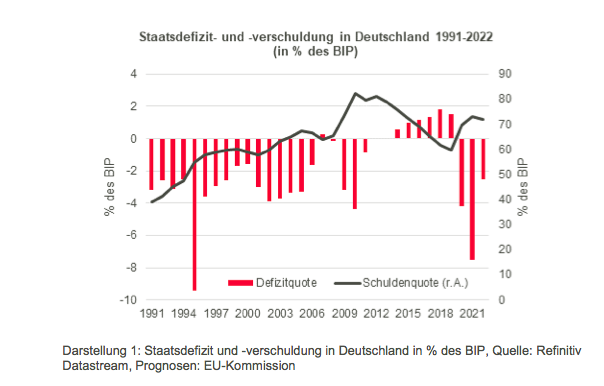 Abhängig vom Auslastungsgrad der Wirtschaft sind für Bund und Länder Abweichungen möglich, die allerdings symmetrisch sein sollen: Überschüsse in guten Zeiten, Defizite in schlechten. Diese „Konjunkturkomponente“ soll eine zyklusverstärkende Wirkung der Finanzpolitik verhindern und insbesondere auch die Funktionsfähigkeit der automatischen Stabilisatoren sicherstellen. In Artikel 115 GG wird dem Bund darüber hinaus ein moderates strukturelles Defizit bis zu einer Höhe von 0,35 Prozent des BIP zugebilligt. Diese „Schuldenbremse“, die den Europäischen Stabilitäts- und Wachstumspakt auf nationaler Ebene umsetzt, gilt nach einer Übergangsphase für den Bund seit 2016, für die Länder seit 2020. Sie ist vielleicht nicht der Hauptgrund für die erfolgreiche Rückführung der Staatsschuldenquote in den 2010er Jahren in Deutschland, dafür dürften das günstige Wachstumsumfeld und niedrige Zinskosten entscheidend gewesen sein. Doch die Verschärfung der Fiskalregeln hat mit hoher Wahrscheinlichkeit geholfen, die politischen Begehrlichkeiten in Schach zu halten (siehe Darstellung 1).