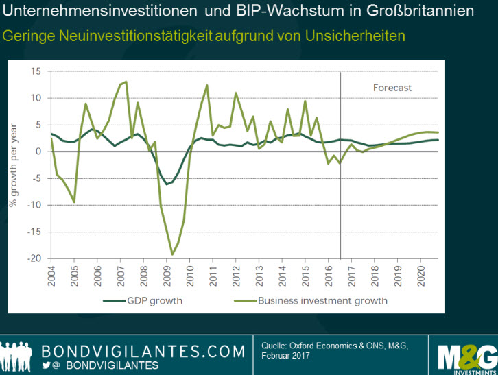 Ich war bei der Präsentation vor Ort und was mich eher beunruhigte, war das düstere Bild, dass das IFS zum BIP-Wachstum in Großbritannien in den kommenden Jahren zeichnete. Letztes Jahr wuchs die britische Wirtschaft um 2%, für dieses Jahr erwartet das IFS eine Abschwächung auf 1,6% und auf 1,3% in 2018. Andrew Goodwin von Oxford Economics führte die voll besetzte Guildhall durch die Bestandteile des BIP und erklärte, wo sich deren Ansicht nach zukünftige Schwachpunkte befinden.