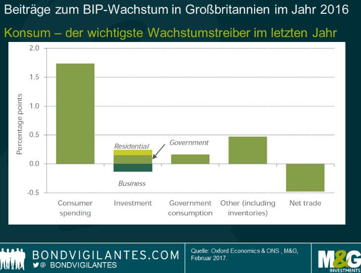 Die unten aufgeführte Grafik – Beiträge zum BIP-Wachstum in Großbritannien im Jahr 2016 – zeigt deutlich, dass die Konsumausgaben letztes Jahr den größten Beitrag zum Wachstum leisteten.