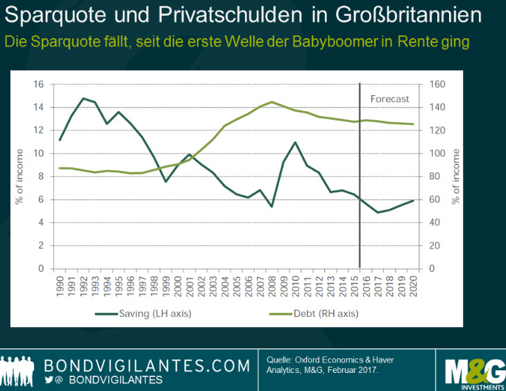 An diesem Argument ist meines Erachtens definitiv etwas dran, vor allem für jene im Erwerbsalter, die bereits jetzt historisch hohe Privatschulden tragen müssen. Wie das IFS selbst in einer folgenden Präsentation (darüber, dass der NHS unter Druck geraten dürfte) hervorhob, wird der Einfluss des demografischen Wandels von entscheidender Bedeutung sein. Ich gehe davon aus, dass diese demografischen Veränderungen in den nächsten Jahren einen erheblichen Beitrag zum Konsumwachstum in Großbritannien leisten werden. Vermutlich ist es kein Zufall, dass die Sparquote rückläufig ist, ungefähr zeitgleich, seitdem der erste Jahrgang der Babyboomer das Renteneintrittsalter erreicht hat.