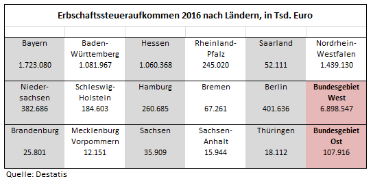 Weit abgeschlagen in der Erbschafts- und Schenkungsstatistik sind die ostdeutschen Bundesländer. Was nicht verwundert. Schließlich wurden große Vermögen, so sie im Osten nach dem Krieg vorhanden waren, in der DDR verstaatlicht. Die Bürger in Ostdeutschland konnten deshalb erst seit der Wende in den 90er Jahren nachhaltig Vermögen aufbauen. Der Effekt ist deutlich zu sehen: In Brandenburg, Mecklenburg-Vorpommern, Sachsen, Sachsen-Anhalt und Thüringen wurde im vergangenen Jahr insgesamt nicht einmal halb so viel Vermögen vererbt wie allein in Hamburg. Nahezu die gesamten Erbschaftsteuereinahmen 2016 stammen aus dem Westen: rund 6,9 Milliarden Euro. Aus dem Osten flossen nur 108 Millionen Euro in die Staatskasse.