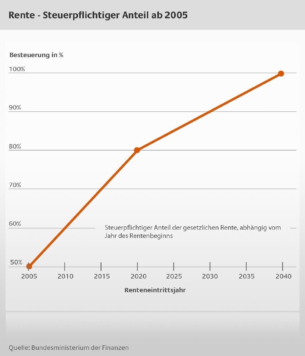Ab diesem Jahr soll der Besteuerungsanteil für jeden neuen Renteneintrittsjahrgang statt bislang einem Prozent auf einen halben Prozentpunkt jährlich reduziert werden. Wer 2023 neu Rente bekommt, soll demnach statt den ursprünglich vorgesehenen 83 Prozent seiner Rente jetzt nur noch 82,5 Prozent besteuern. Ihre volle Rente müssen demnach nicht die Neurentner im Jahr 2040, sondern erst die Neurentner im Jahr 2058 versteuern.