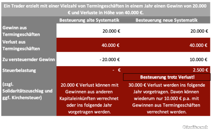 Ein paradoxer Effekt der Gesetzesänderung ist, dass Anleger, die im Laufe eines Jahres im Rahmen von verschiedenen Derivate-Geschäften per Saldo einen Verlust von mehr als 10.000 Euro erzielen, für dieses Jahr unter Umständen trotzdem Steuern bezahlen müssen. Konkretes Beispiel: Ein Anleger erzielt durch den Kauf und Verkauf von Optionen 20.000 Euro an Gewinnen und 40.000 Euro an Verlusten. Nach der neuen Regelung kann er jetzt aber nur noch 10.000 Euro an Verlusten geltend machen und weitere 30.000 Euro an Verlusten ins kommende Jahr übertragen, wovon er dann wieder nur 10.000 Euro an Verlusten mit möglichen Termingeschäftsgewinnen verrechnen kann. Dessen ungeachtet zahlt er 2.500 Euro Abgeltungsteuer plus Soli, obwohl er de facto ein wirtschaftliches Minus von 20.000 Euro erzielt hat.