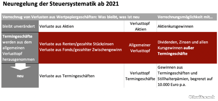 Ende Dezember 2019 Jahres hat die Bundesregierung die Besteuerung von Termingeschäften neu geregelt. Die Verlustverrechnung wird ab Januar 2021 massiv eingeschränkt. Sollte es danach zu einem ähnlichen Kurssturz kommen wie Anfang 2020, wären die Folgen katastrophal.