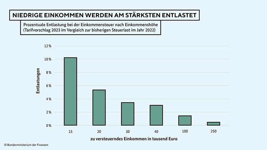 Dies lehnt das Bundesfinanzministerium ab, da Besserverdienende relativ und absolut mehr Steuern tragen und die Reform die kalte Progression dämpfen soll. Schließlich würden Bezieher niedriger Einkommen relativ zu ihrem Einkommen deutlich stärker entlastet (siehe Grafik Niedrige Einkommen werden am stärksten entlastet).