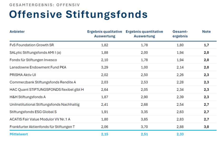 Mit der Gesamtnote 1,7 (Gut-) ist der FvS Foundation Growth SR Testsieger im Segment Offensive Stiftungsfonds. Auch hier lag laut Wagner dieGold-Quote mit acht bis zehn Prozent beständig am oberen Ende der zulässigen Bandbreite, wodurch er sich insbesondere im vergangenen Jahr in seiner Peergroup abheben konnte. „In der bisherigen Fondshistorie wurde die Flexibilität bei der zulässigen Aktienquote nahezu ausgeschöpft, was ihn im Vergleich unterdurchschnittliche Risikokennzahlen gibt,“ betont Wagner. Der US-Aktienmarkt werde im Fonds tendenziell übergewichtet. Bedeutende Sektoren seien Technologie, Finanzwesen, Gesundheitswesen und defensive Konsumwerte. Die diversifizierte Allokation in den Sektoren unterstreiche sein gutes Risikomanagement, so Wagner. Auf dem zweiten Platz folgen mit der Note 2,0 der SALytic Stiftungsfonds AMI I (a) und derFonds für Stiftungen Invesco. Letzterer weise über drei Jahre eine der niedrigsten Volatilitäten innerhalb der offensiven Stiftungsfonds auf und habe im vergangenen Jahr eine überdurchschnittliche Rendite erzielt.